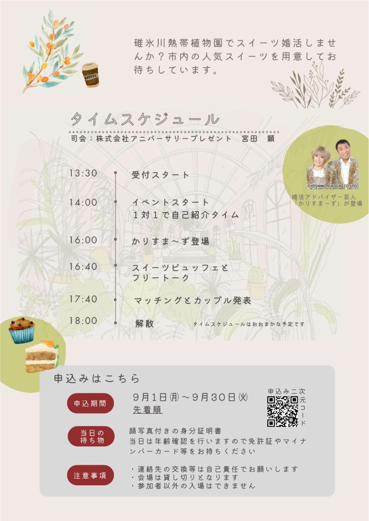 イベント当日は、婚活アドバイザーとしても活躍している吉本興業の芸人「かりすま~ず」も登場しイベントを盛り上げるほか、市内で人気のスイーツをビュッフェスタイルでお楽しみいただけます。