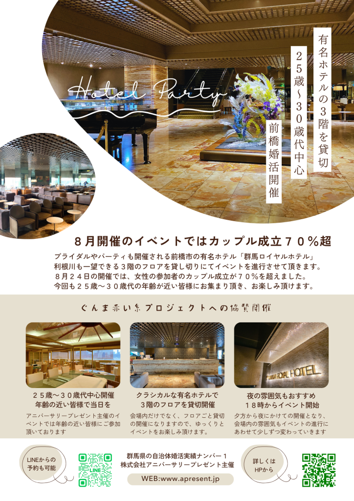 - ・群馬県の自治体婚活でも実績のあるアニバーサリープレゼント主催の前橋婚活。有名ホテルの3階を貸切にて開催させて頂きます。