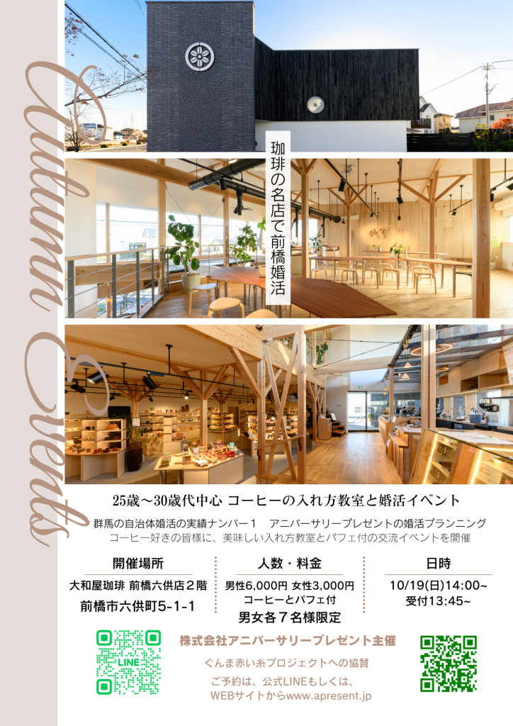 - ・群馬県の自治体婚活でも実績のあるアニバーサリープレゼントがコーヒーの入れ方教室付きの前橋婚活をプランニングいたしました。