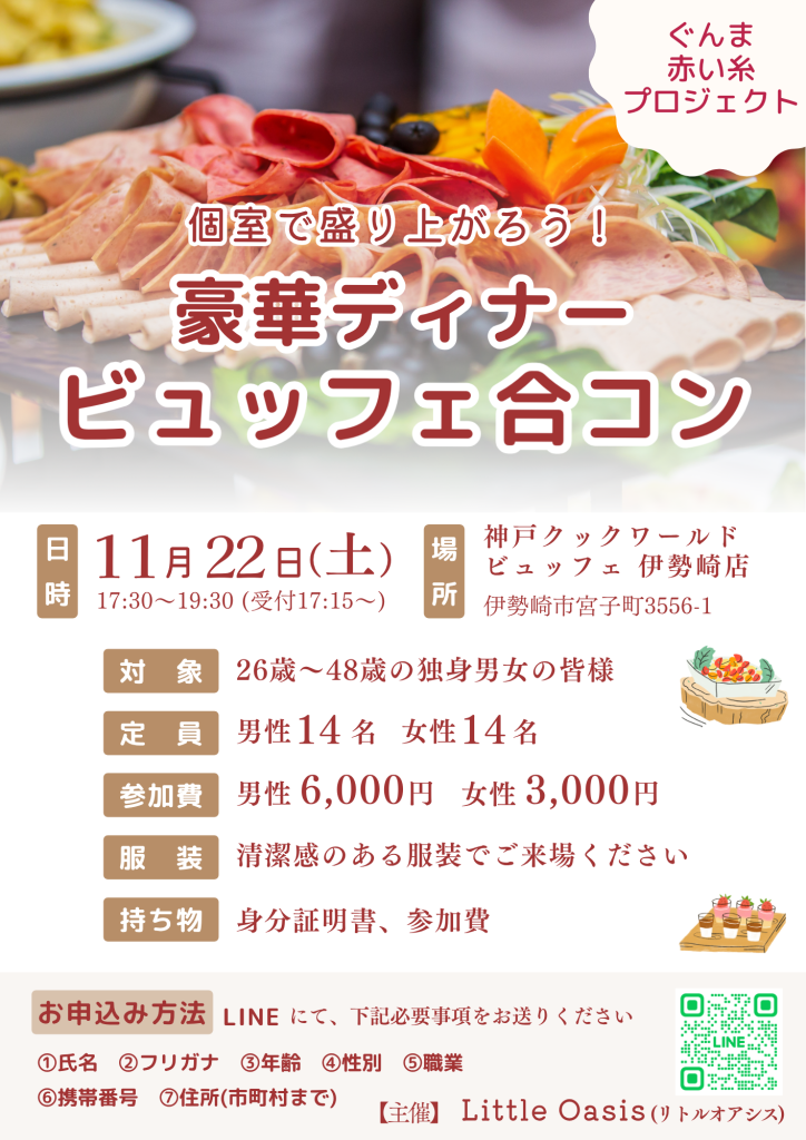 【11/22 ビュッフェ】と【①氏名】【③年齢】【⑦住所(市町村まで)】をお送りください。
