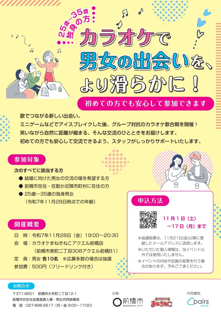 前橋市は結婚を希望する男女の出会いの場として、株式会社コシダカホールディングス(共同運営企業:株式会社エウレカ)と共創で、「カラオケで男女の出会いを、より滑らかに」と題して婚活イベントを開催します。