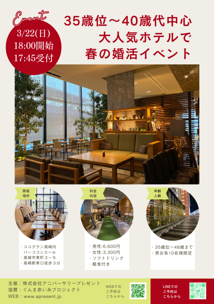 - ・大人気ホテル「ココ・グラン高崎」のバーラウンジを貸し切りで、春の婚活イベントを開催致します。
