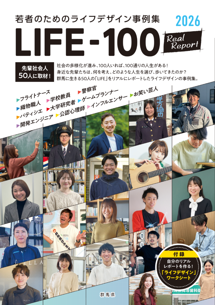 「LIFE-100リアルレポート」は、群馬にゆかりのある社会人100名の人生を取材した、ライフデザインの事例集です。