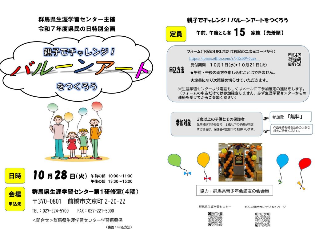 群馬県生涯学習センターでは県民の日特別企画として「親子でチャレンジ!バルーンアートを作ろう」を開催します。