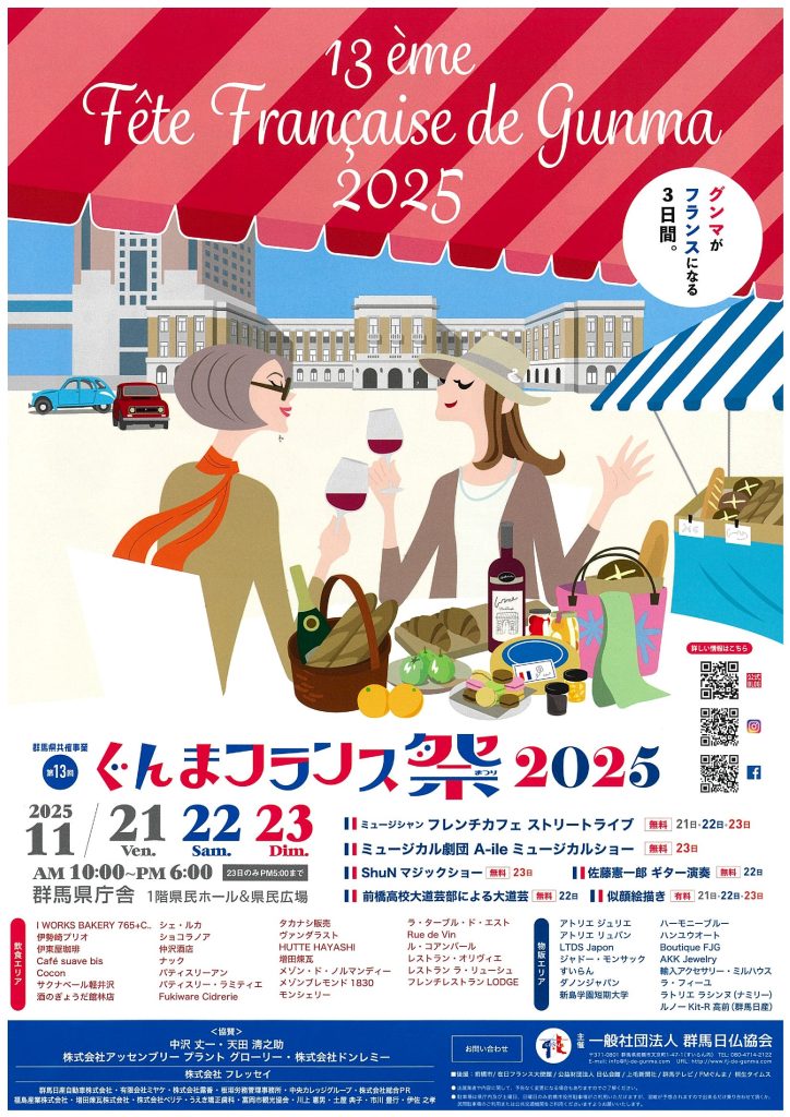 11月21日(金曜日)から23日(日曜日)までの3日間、群馬県庁において「第13回ぐんまフランス祭2025」を開催します。