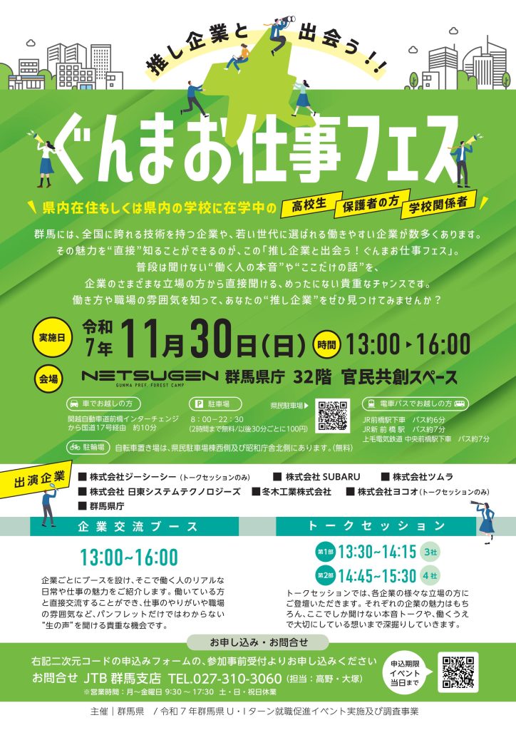県内の高校生・保護者・学校関係者を対象に、企業と直接交流できるイベント「推し企業と出会う!ぐんまお仕事フェス」を開催します。