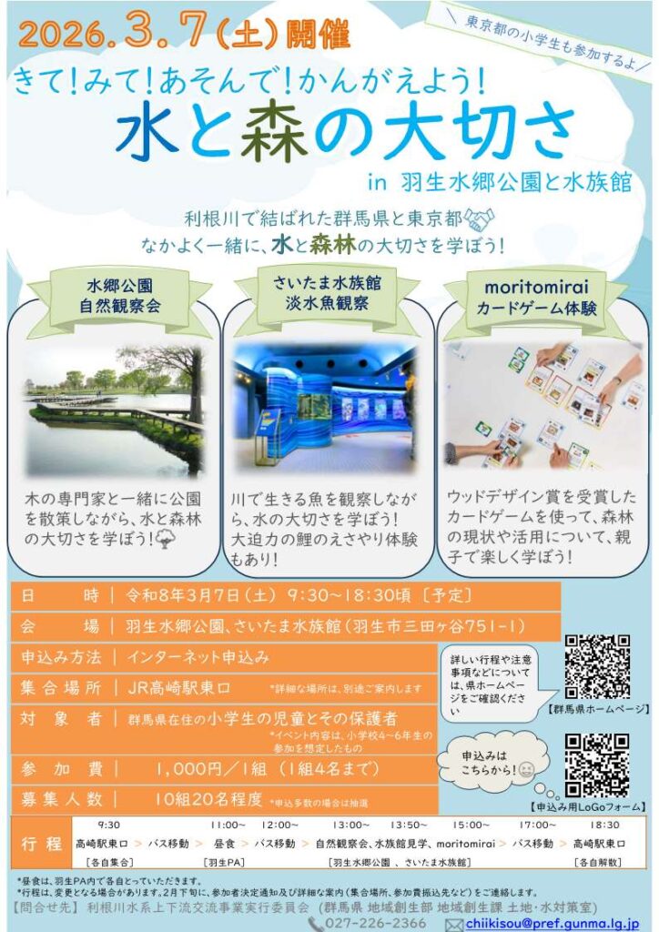 群馬県と東京都で設立した利根川水系上下流交流事業実行委員会では、利根川の上下流 に暮らす群馬県民と東京都民の相互の交流を通じて、水と水を育む森林の大切さについて学ぶための交流事業を開催します。